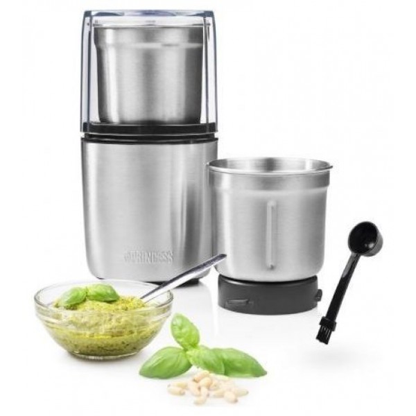 La multipicadora y molinillo Princess incluye dos recipientes y cuchillas para ingredientes secos y húmedos. Las cuchillas para moler se pueden utilizar con granos de café o especias para conseguir mezclas aromáticas. El recipiente para picar cuenta con cuatro cuchillas que pican finamente o a trozos más grandes (según el tiempo durante el que esté la picadora en funcionamiento) ajo, verduras y hierbas frescas. Ideal para preparar pesto, aceite con hierbas y pasta de curry caseros.