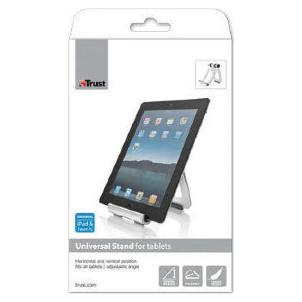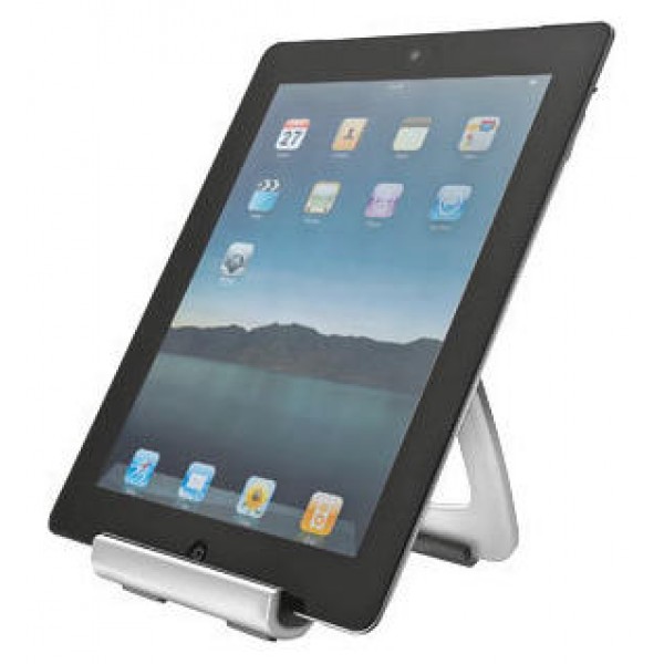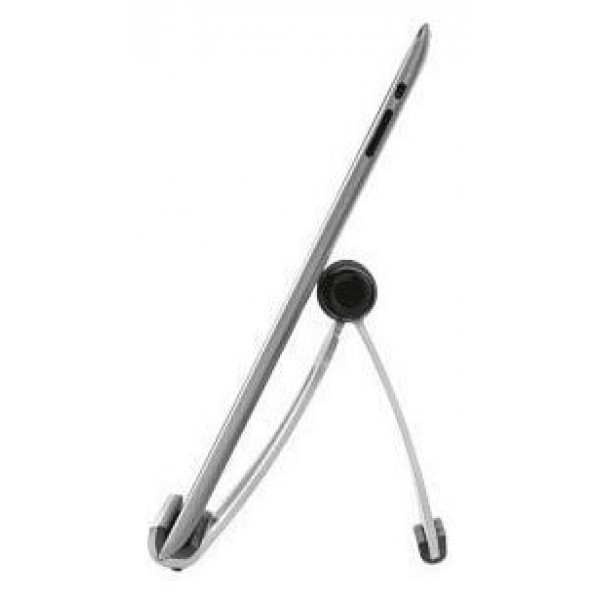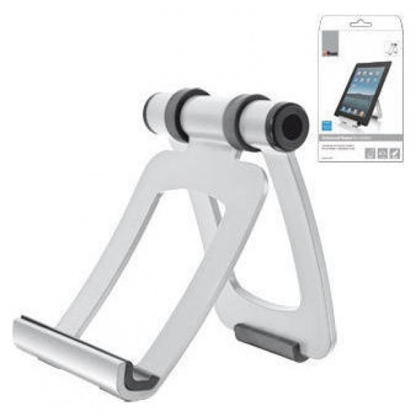 Soporte universal para tableta para disfrutar de una cómoda posición de visualización; se puede utilizar con casi cualquier tipo de tableta. Al plegarse, queda completamente plano, con lo cual puede transportarse fácilmente en cualquier bolsa. Ángulo de visualización ajustable. Posición vertical u horizontal.