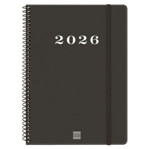 Agenda de espiral de estilo moderno y universal con tapa dura de cartón forrado con peliculado mate antirrayaduras. Ideal para uso personal y/o profesional. Con goma elástica. Esquinas microperforadas para localizar rápidamente el día/semana en curso. Contiene información de interés en la anualidad y otros contenidos extra. Formato similar a DIN A5 con las ventajas de una agenda portable y una de sobremesa. Duración: Enero 2026 - Diciembre 2026 (12 meses). Interior: Semana Vista Horizontal. Visión de la semana completa en horizontal que permite la escritura natural. Con espacio para concretar horario. Con información de los festivos de España. La anualidad de la agenda incluye la información relativa a: onomástica, festivos nacionales, cambios de estación e inicios de los años nuevos chino, musulmán, ortodoxo y hebreo. La agenda dispone también de otros contenidos extra: datos personales, horarios, calendarios, planificación anual del año y del año siguiente, festivos internacionales, cómo buscar en Google, usos del teclado, mapa de Europa y de los husos horarios, hojas para notas y hojas para teléfonos, direcciones y e-mails. Idioma del artículo: español. Formato: E10 - 155x212 mm. Tapas de cartón forrado con peliculado mate antirrayaduras, espiral simple metálica y papel. 80 g/m². Papel FSC®.