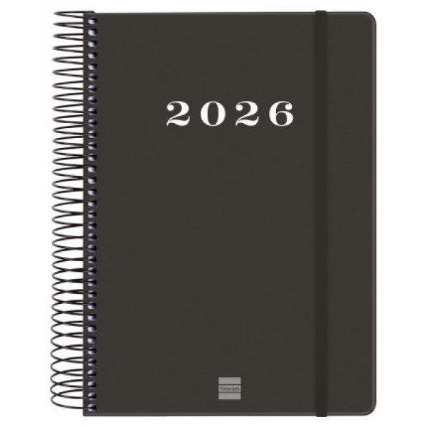 Agenda de espiral de estilo moderno y universal con tapa dura de cartón forrado con peliculado mate antirrayaduras. Ideal para uso personal y/o profesional. Con goma elástica. Esquinas microperforadas para localizar rápidamente el día/semana en curso. Contiene información de interés en la anualidad y otros contenidos extra. Formato similar a DIN A5 con las ventajas de una agenda portable y una de sobremesa. Duración: Enero 2026 - Diciembre 2026 (12 meses). Interior: 1 Día Página. Amplio espacio de escritura para cada día. Con horas. Sábados y domingos en página completa. Con información de los festivos de España. La anualidad de la agenda incluye la información relativa a: onomástica, festivos nacionales, cambios de estación e inicios de los años nuevos chino, musulmán, ortodoxo y hebreo. La agenda dispone también de otros contenidos extra: datos personales, horarios, calendarios, planificación anual del año y del año siguiente, festivos internacionales, cómo buscar en Google, usos del teclado, mapa de Europa y de los husos horarios, hojas para notas y hojas para teléfonos, direcciones y e-mails. Idioma del artículo: español. Formato: E10 - 155x212 mm. Tapas de cartón forrado con peliculado mate antirrayaduras, espiral simple metálica y papel. 70 g/m². Papel FSC®.