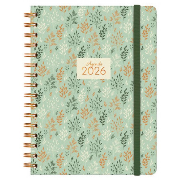 Agenda de espiral con tapa dura de cartón forrado con peliculado mate antirrayaduras. Diseño elegante y en tendencia con detalles estampados metalizados. Ideal para uso personal y/o profesional. Con goma elástica y esquinas microperforadas para localizar rápidamente el día/semana en curso. El diseño interior es limpio y fácil, con espacio suficiente para organizar tus proyectos, tareas y compromisos. Contiene información de interés en la anualidad y otros extra para la organización personal. Además, incorpora un set de adhesivos temáticos. Formato similar a DIN A5 con las ventajas de una agenda portable y una de sobremesa. Duración: Enero 2026 - Diciembre 2026 (12 meses). Interior: Semana Vista Horizontal. Visión de la semana completa en horizontal que permite la escritura natural. Con espacio para concretar horario. Con información de los festivos de España. La anualidad de la agenda incluye la información relativa a: onomástica, festivos nacionales, cambios de estación e inicios de los años nuevos chino, musulmán, ortodoxo y hebreo. La agenda dispone también de otros contenidos extra: datos personales, calendarios, horarios, objetivos del año, plan anual, fechas importantes, otras fechas, hojas para checklist, hojas para notas, hoja para ocio, hojas para teléfonos, direcciones y e-mails y dos hojas de pegatinas orientadas a la organización personal. Artículo en español con anualidad multilingüe: español, euskera, gallego y catalán. Formato: E10 - 155x212 mm. Tapas de cartón forrado con peliculado mate antirrayaduras. Espiral doble metálica. Papel. 80 g/m². Papel FSC®.