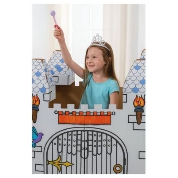 Castillo fabricado en cartón resistente y reciclable con certificado FSC impreso con tintas no tóxicas. Con bordes redondeados de seguridad. Fácil montaje en 5 piezas sin necesidad de cinta adhesiva o pegamento. Diseño interactivo, se pueden abrir puertas.