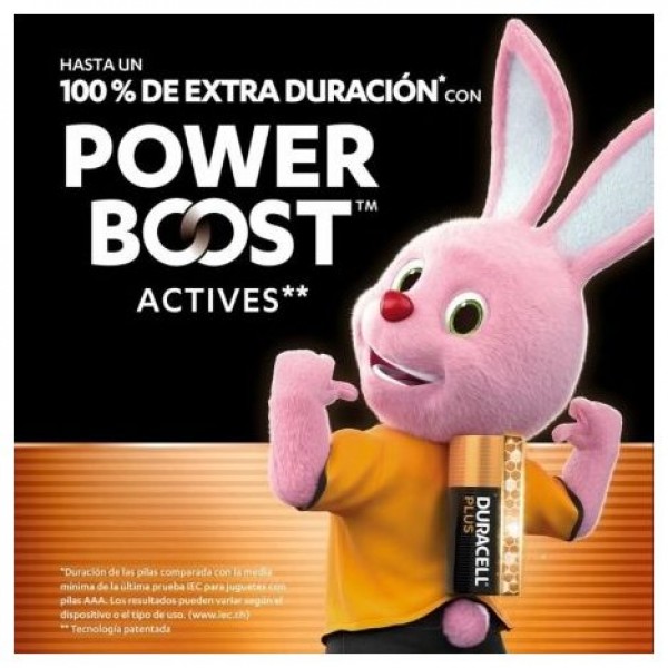 Las pilas alcalinas AAA Duracell Plus contienen los activos patentados POWER BOOST, una mezcla única de litio y níquel, que ofrece un rendimiento duradero para tus dispositivos