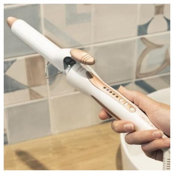El rizador cuenta con un revestimiento de queratina y aceite de argán con base de turmalina para aportar fuerza al cabello a la vez que le da brillo y suavidad.
