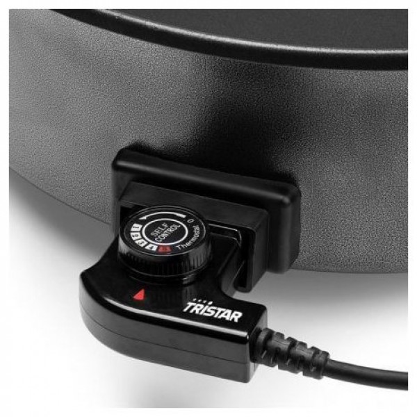 Las características de la sartén eléctrica Tristar hacen que sean incluso más sencilla de usar. La sartén tiene un gran volumen con un diámetro de 40 cm. Cuenta con asas integradas para poder mover la sartén con seguridad. Además, la sartén incluye un termostato ajustable con un cable de alimentación extraíble. Gracias a su base antideslizante, es muy estable. Eche un vistazo a la comida a través de la tapa transparente con válvula de vapor, que permite que el calor salga fácilmente.Contenido de la caja