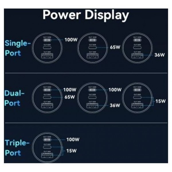 - Salida USB-C1 + USB-C2 + USB-A1: 100W + 15W