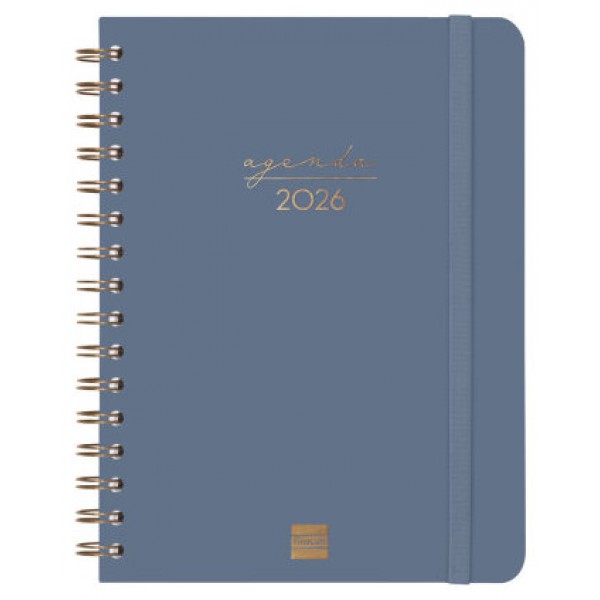 Agenda de espiral de tapa dura de cartón forrado con peliculado mate antirrayaduras. Diseño elegante y sofisticado con detalles estampados metalizados. Ideal para uso personal y/o profesional. Con goma elástica y esquinas microperforadas para localizar rápidamente el día/semana en curso. Incorpora un set de adhesivos temáticos. El diseño interior es limpio y fácil, con espacio suficiente para organizar tus proyectos, tareas y compromisos. Contiene información de interés en la anualidad y otros contenidos extra orientados a la organización personal. Formato similar a DIN A5 con las ventajas de una agenda portable y una de sobremesa. Duración: Enero 2026 - Diciembre 2026 (12 meses). Interior: Semana Vista Horizontal. Visión de la semana completa en horizontal que permite la escritura natural. Con espacio para concretar horario. Con información de los festivos de España. La anualidad de la agenda incluye la información relativa a: onomástica, festivos nacionales, cambios de estación e inicios de los años nuevos chino, musulmán, ortodoxo y hebreo. La agenda dispone también de otros contenidos extra: datos personales, calendarios, horarios, objetivos del año, plan anual, fechas importantes, otras fechas, hojas para checklist, hojas para notas, hoja para ocio, hojas para teléfonos, direcciones y e-mails y dos hojas de pegatinas orientadas a la organización personal. Artículo en español con anualidad multilingüe: español, euskera, gallego y catalán. Formato: E10 - 155x212 mm. Tapas de cartón forrado con peliculado mate antirrayaduras. Espiral doble metálica. Papel. 80 g/m². Papel FSC®.
