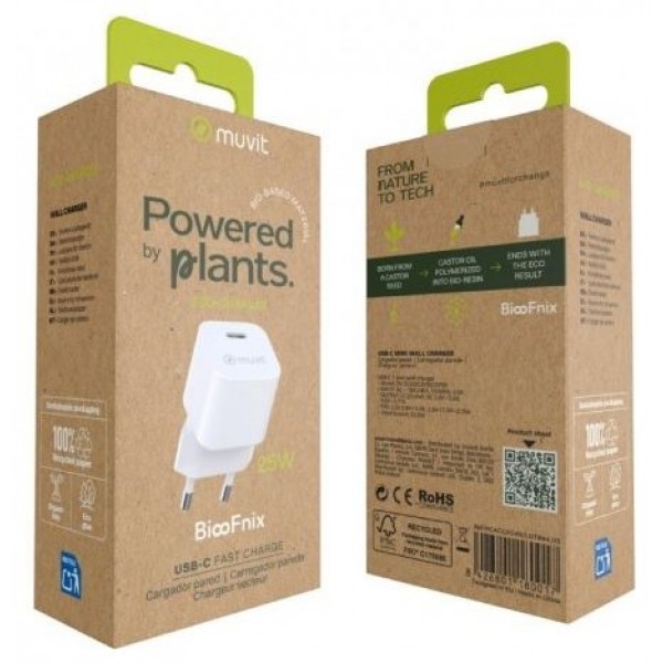 El cargador de pared muvit for change BiooFnix 25W representa una nueva generación de tecnología más respetuosa con el planeta. Fabricado a partir de aceite de ricino transformado en bioresina, este cargador nace literalmente de una semilla, como símbolo de innovación sostenible y compromiso medioambiental.
