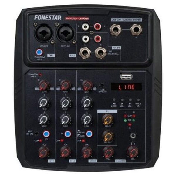 Mezclador estéreo de 4 canales con función live streaming, tarjeta de audio para PC y grabador/reproductor Bluetooth®/USB .
