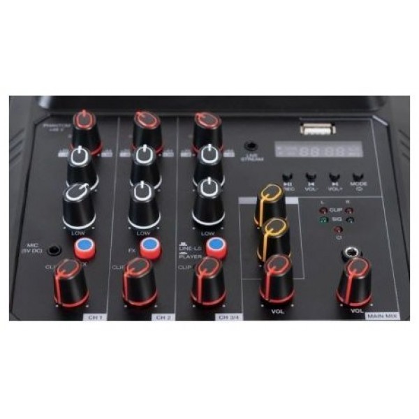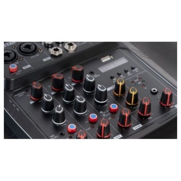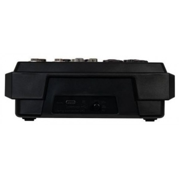 Tiene un tamaño muy reducido y portátil, perfecto para artistas ambulantes, estudios musicales domésticos, pequeños eventos o fiestas, etc. Además, solamente necesita alimentación de 5 V CC, 2"1 A, que puede ser proporcionada por el adaptador, por el puerto USB de un PC o portátil o a través de una power bank, lo que aumenta enormemente la versatilidad y posibilidades de uso de este completo mezclador.