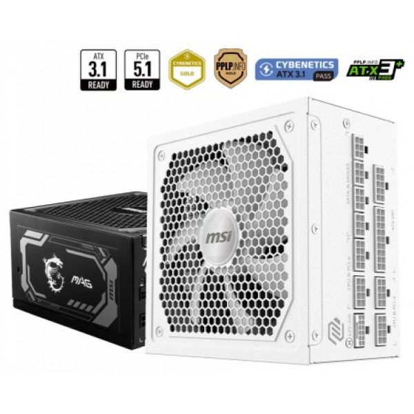 FUENTE ALIMENTACION MSI MAG A1000GL PCIE5 WHITE,PSU,1000W,80 PLUS GOLD,MODULAR,135MM,ACTIVE PFC,PCI-E 5.0 (16 PIN)X1,PCI-E (6+2 PIN)X4,SATA (15 PIN)X12 (Espera 4 dias)