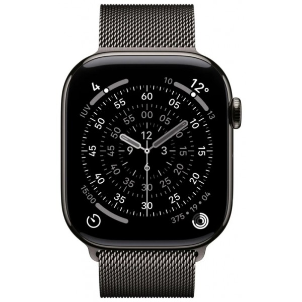 - Tamaño y peso: Alto: 46 mm, Ancho: 39 mm, Grosor: 9,7 mm, 416 x 496 píxeles, Superficie de pantalla de 1.220 mm², Peso (aluminio, GPS): 37,8 g, Peso (aluminio, GPS + Cellular): 36,9 g, Peso (titanio): 43,1 g, Para muñecas de 140 a 245 mm