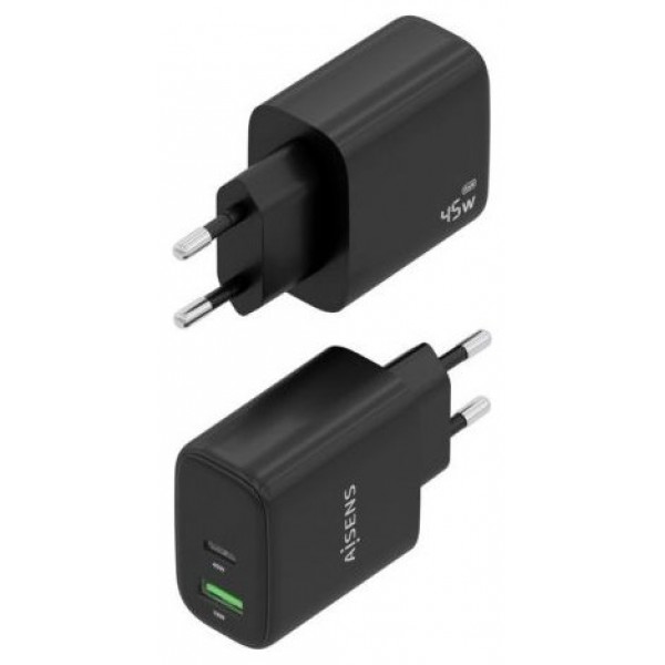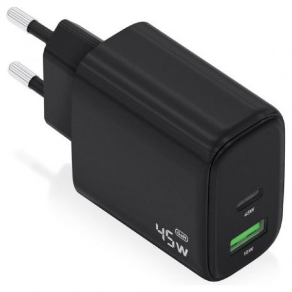 A110-0972 – Cargador GaN 45W, 1xUSB-C PD3.0 QC4.0, 1xUSB-A QC3.0, Negro