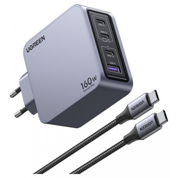 Ugreen Nexode Pro 160W GaN Charger with USB-C Cable. Tipo de cargador: Interior, Alimentación: Corriente alterna, Compatibilidad del cargador: Universal, Carga rápida, Funciones de protección de poder: Sobreintensidad, Sobrevoltaje, Sobrecalentamiento. Color del producto: Negro, Gris